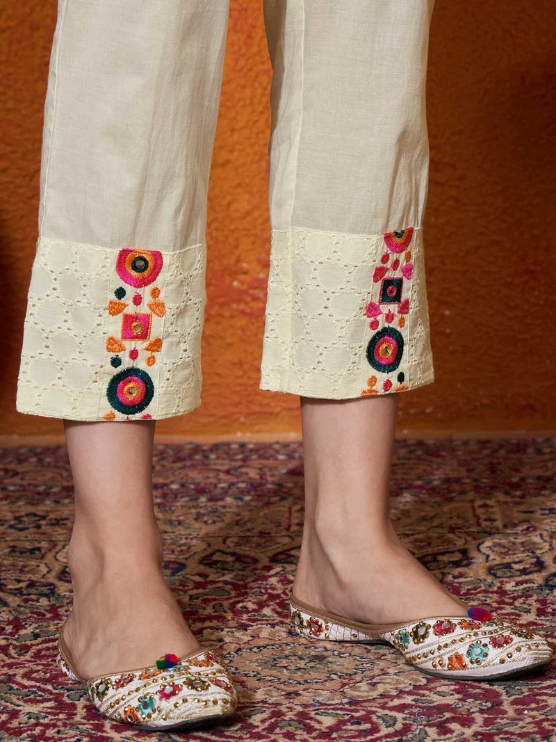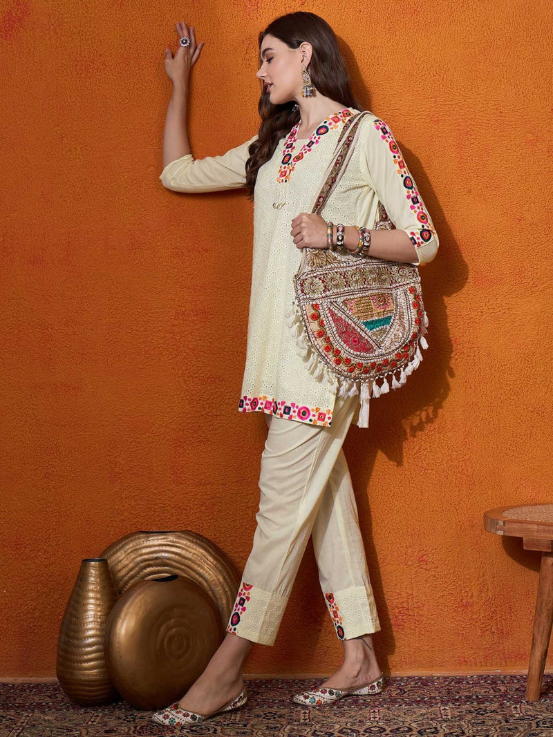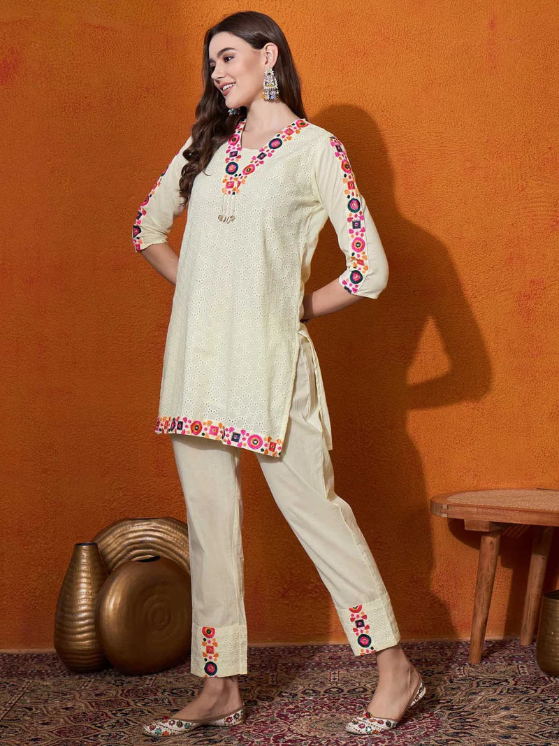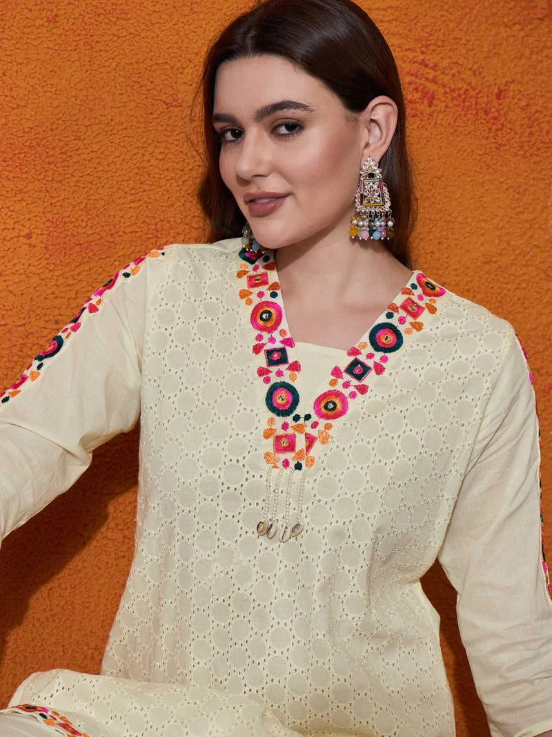 Introducing Shahikapda off white coord set with colourfull embroidery